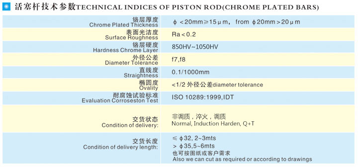 本產品表面經特殊研磨及硬鉻電鍍技術外理,再經鏡面拋光而成,具有耐磨擦、抗腐蝕性特性,可用作各種氣缸、油缸、包裝機械、木工機械、紡織機械、印染機械、壓鑄機、注塑機及其它機械的導桿、頂桿。